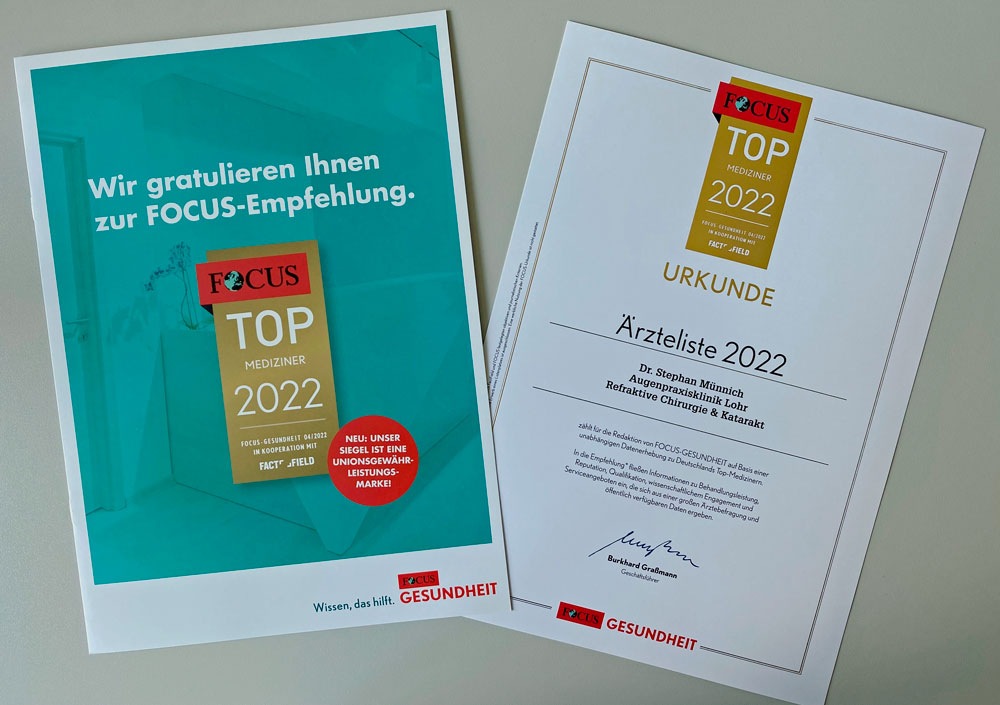 Die FOCUS GESUNDHEIT- Redaktion präsentiert jene Mediziner, die als absolute Spezialisten ihres Fachs gelten und sich über ihre Behandlungsleistung hervorheben. Alle Mediziner werden kostenfrei und nach objektiven Kriterien in der Erhebung berücksichtigt. Die Veröffentlichung in der finalen Liste ist ebenfalls kostenlos und nicht käuflich. In seinem Fachbereich "Refraktive Chirurgie & Katarakt" wurde Dr. Stephan Münnich auch im Jahr 2022 zu den empfohlenen Medizinern gewählt.